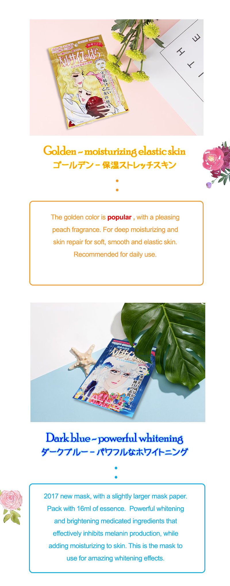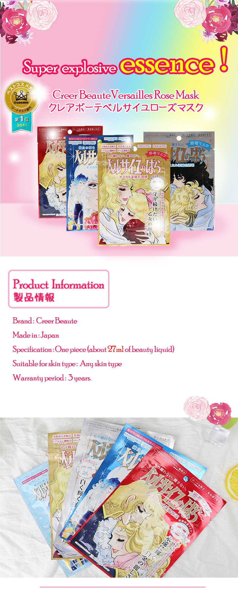 The Rose Of Versailles Antoinette Face Mask contains Nano-platinum, royal jelly, rose water, passion fruit peel extract, grapefruit extract and hyaluronic acid, moisturizes skin and adds a seductive charm. This mask uses high penetration paper. With high-quality fiber and unique 3 layers design ensuring that it adheres well to skin allowing skin to fully absorb the beauty fluid.