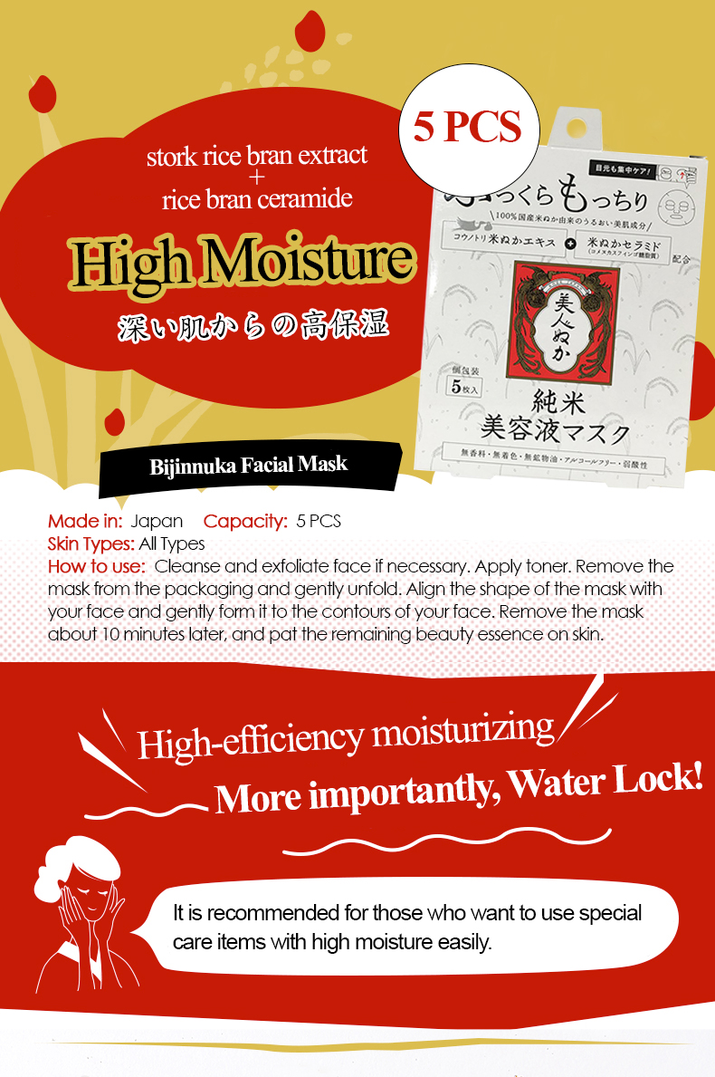 Cleanse and exfoliate face if necessary. Apply toner. Remove the mask from the packaging and gently unfold. Align the shape of the mask with your face and gently form it to the contours of your face. Remove the mask about 10 minutes later, and pat the remaining beauty essence on skin.