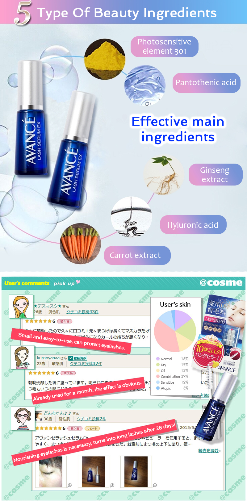 An eyelash tonic that promotes eyelash growth, strengthens and moisturizes to prevent eyelash loss through frequent usage of eyelash curlers and mascaras. With a mascare-type brush for easy application. Use on areas where lash loss and thin lashes are of concern.
