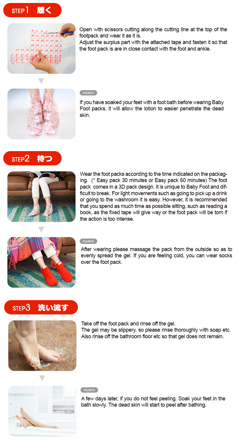 1. Please perform a patch test prior to use to ensure there are no abnormal skin reactions. 2. With a pair of scissors, cut along the dotted lines as indicated on the foot packs. 3. Wear the Easy Packs on both feet after cleansing and drying. If the boots are too big, wrap and tape the excess. Please ensure that the gel doesn't leak or spread when wearing the cover. 4. Soak the foot for 30 mins, allowing the gel to absorb into the soles. 5. Take the Easy Packs off, then wash feet gently with soap. 6. The dead skin cells will become dry in 2-7 days after initial application. (the period of time till the result come out depends on individuals) Start the peeling process by rubbing each foot very gently with a clean cloth or the palm of your hand. 7. Dead skin cells will continue to peel naturally for about 1 week, leaving your feet soft and smooth.