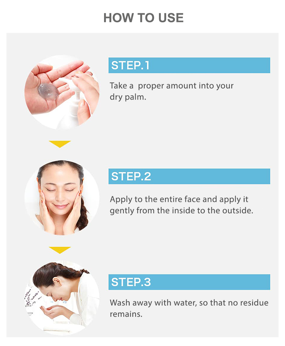 Take an appropriate amount in the palm of your hand, lather well with lukewarm water and massage on skin, rinse thoroughly so that there is no residue left.