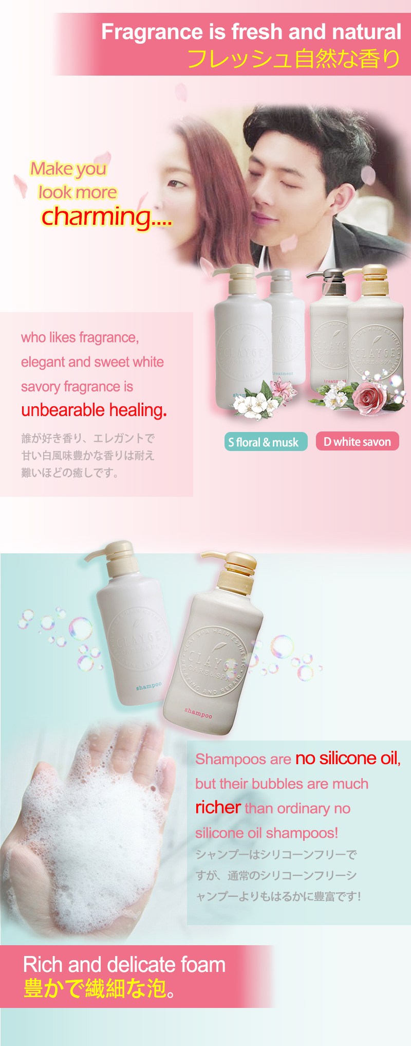 DESCRIPTION Natural marine clay is gentle to both hair and scalp. It absorbs dirt from scalp and washes up while hydrating hair and scalp. With 4 kinds of oils, Baobab, Argan, Jojoba and Marula to care and moisturize damage hair. Manuka honey rich in vitamins and minerals to give hair tenderness and luster. After shampooing, the ingredients from the plants soften skin and tighten scalp pores. Silicon free formula.