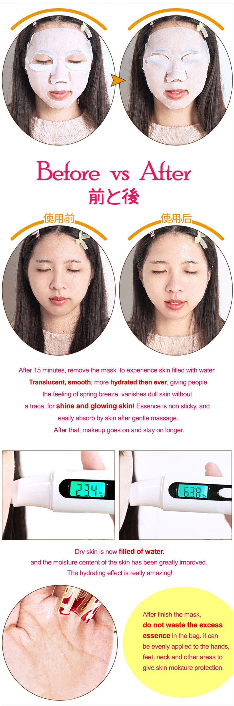 1. After cleansing and toning, remove a mask from the bag. Carefully unfold mask. 2. Smooth mask onto face, avoiding sensitive eyes and lip areas. 3. Wear mask for 10 - 15 minutes, and remove. 4. Massage remaining essence into skin until fully absorbed.