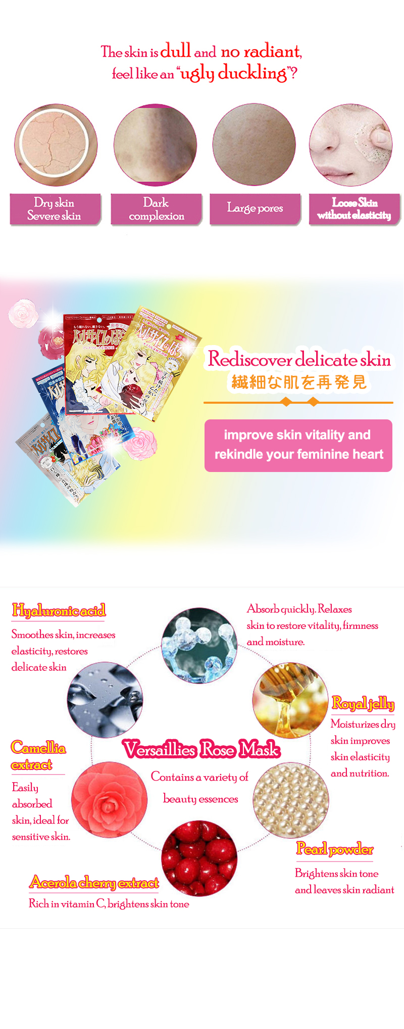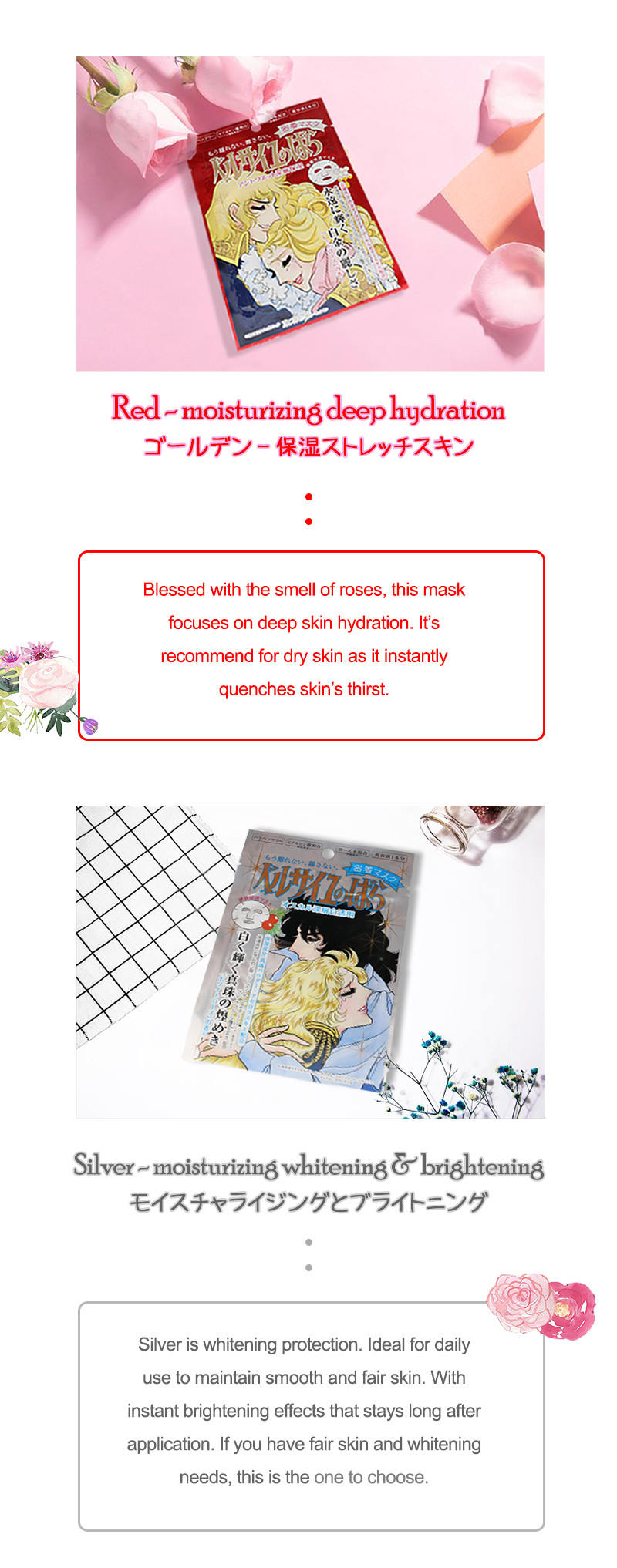 The Rose Of Versailles Oscar & Rosalie Face Mask contains Pomegrante Flower Extract, Camellia Extract and Hyaluronic Acid, it moisturizes your skin. Using highly penetration paper. With high-quality fiber and unique 3 layers design ensuring that it adheres well to skin allowing skin to fully absorb the beauty fluid.