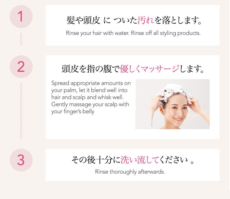 1. Wet hair and pour small amount onto palm. 2. Massage shampoo into scalp with your fingertips and use scalp brush to massage around scalp. 3. Rinse off with water.