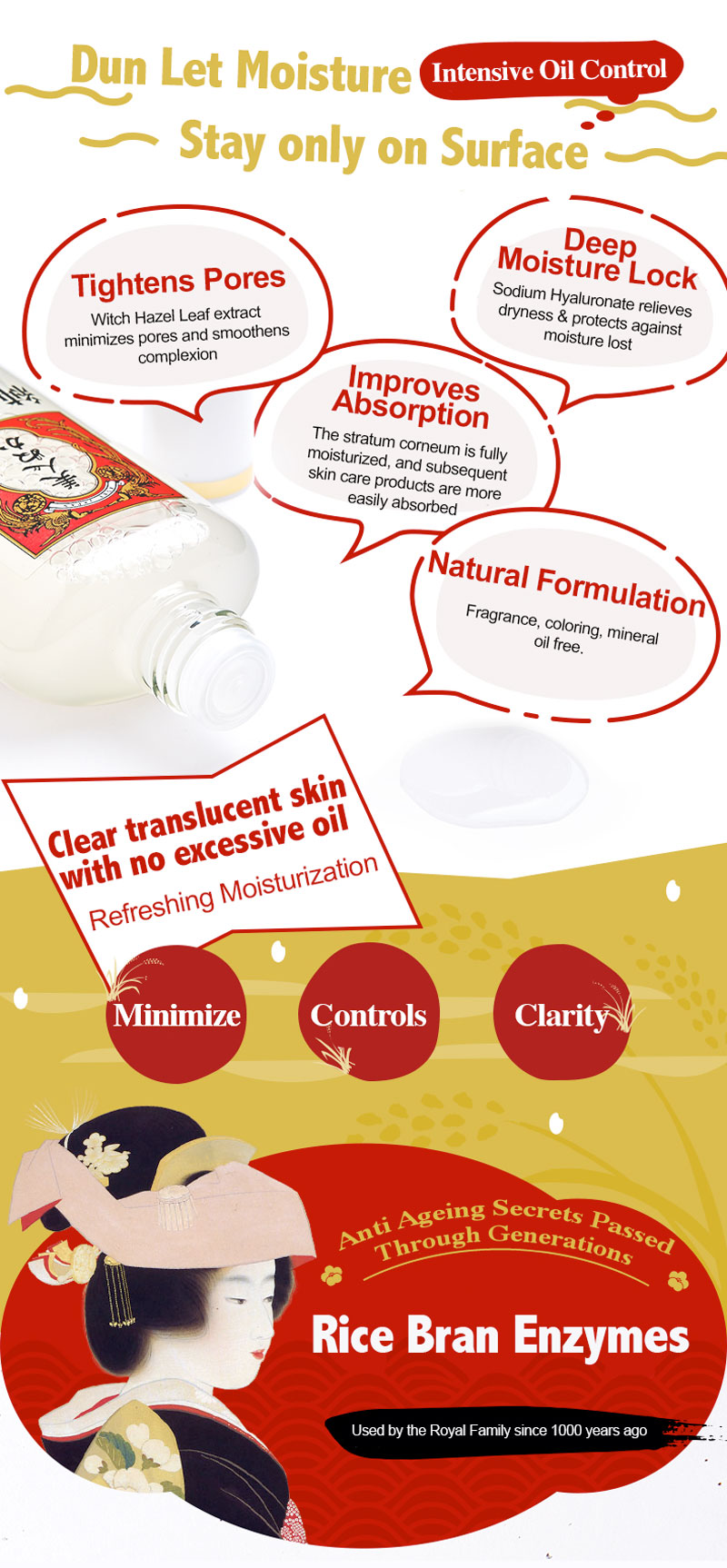 Refreshing water type skin lotion that suppresses extra sebum for moist and smooth skin. With skin beautifying ingredients such as fermented rice bran and rice bran extract rich in Amino Acids and Vitamin E. Protects skin surface against moisture lost and external stimuli with Ceramide. Keeps skin moist and supple.