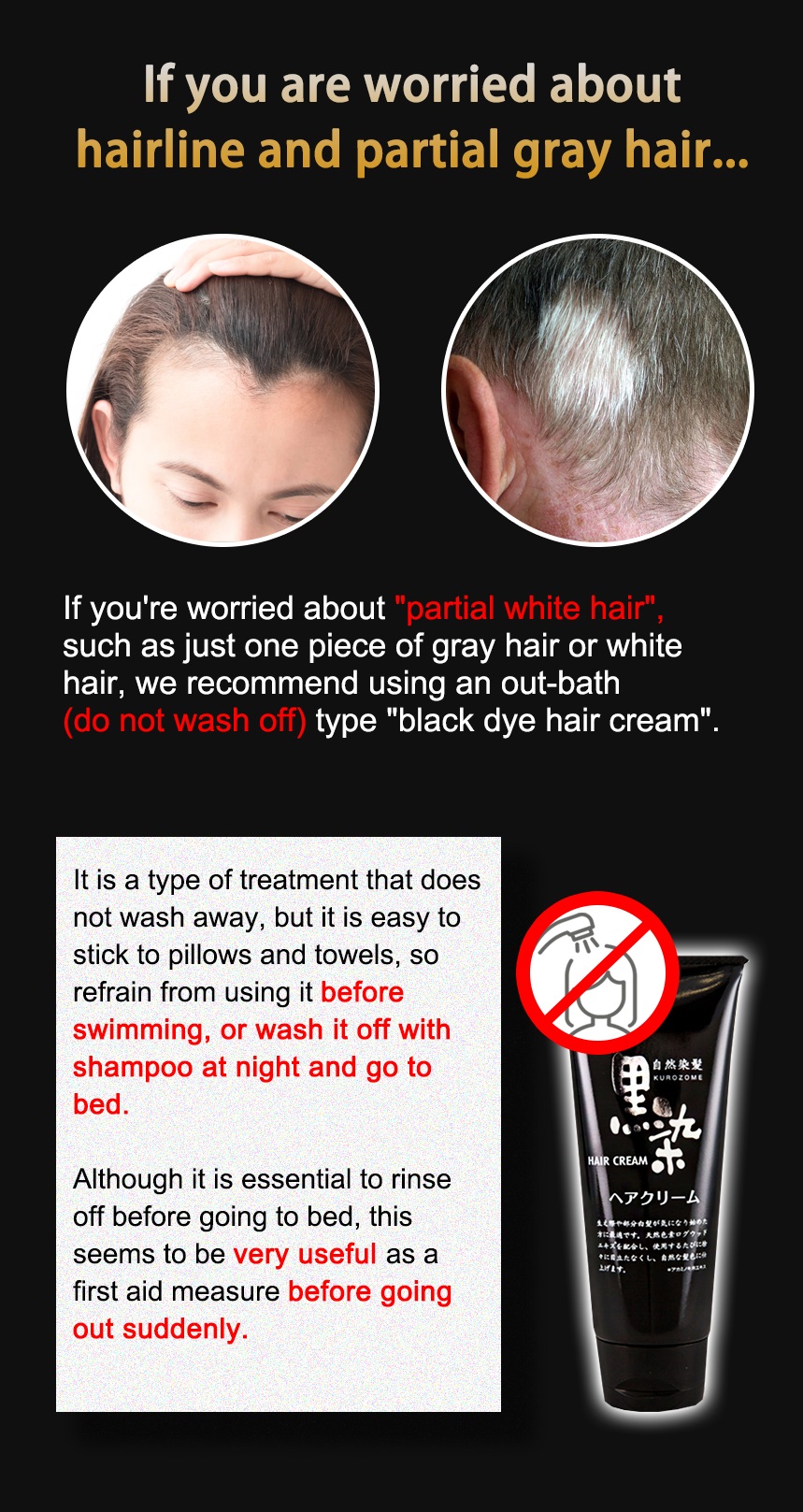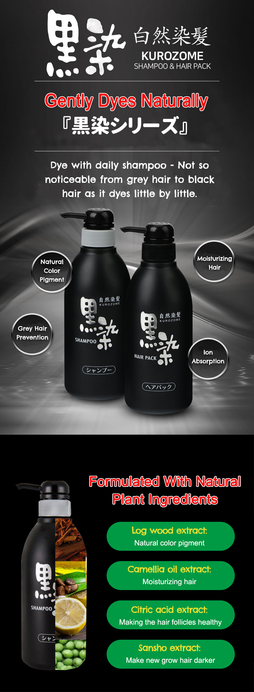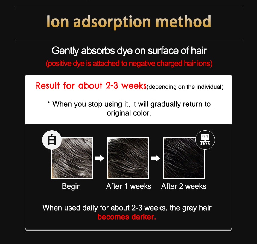 A black dye hair cream for caring of gray hair. Simply use this as a hair styling agent to gradually make the gray hair less noticeable. Containing natural plant-derived ingredients such as Logwood extract, Camellia oil, etc to gradually help color hair to it’s natural glossy black. Gently absorbs dye on surface of hair (positive dye is attached to negative charged hair ions), does not damage scalp or hair.