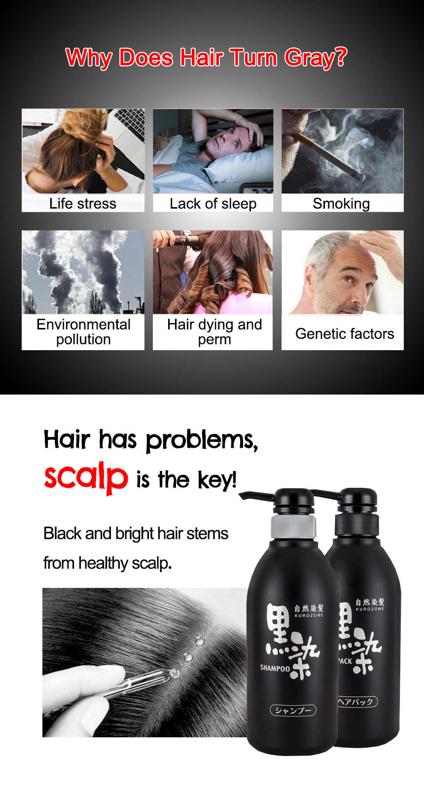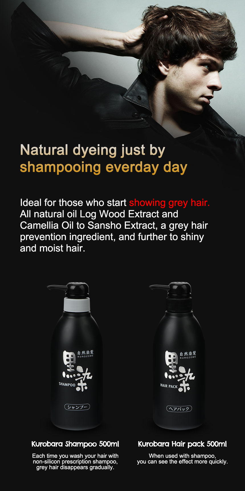 A black dye hair shampoo for caring of gray hair. Containing natural plant-derived ingredients such as Logwood extract, Camellia oil, etc to gradually help color hair to it’s natural glossy black. Gently absorbs dye on surface of hair (positive dye is attached to negative charged hair ions), does not damage scalp or hair. Be sure to use Black Dye Hair Pack after the shampoo.