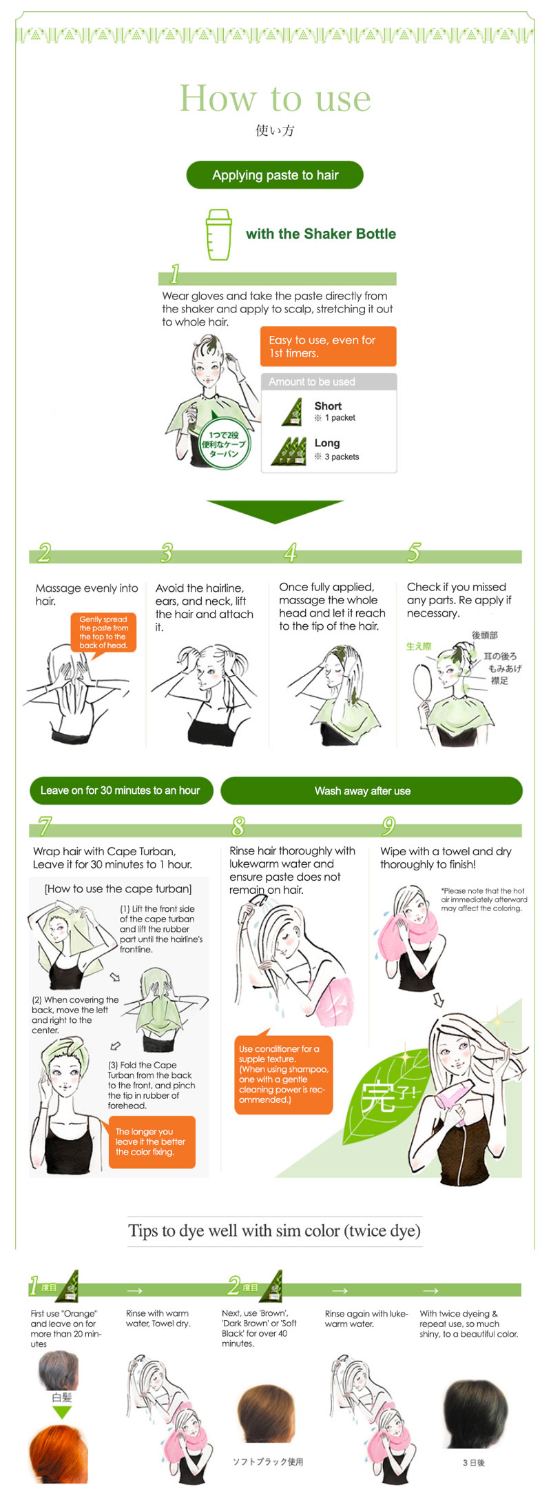 1. Put hot water and Henna into the shaker. Shake well to mix. 2. Wear the gloves and cape turben, and apply the paste to top of head all the way to hairs end. Cover hair with cape turben, and leave it on for about 30 minutes. 3. Rinse hair well with warm water.