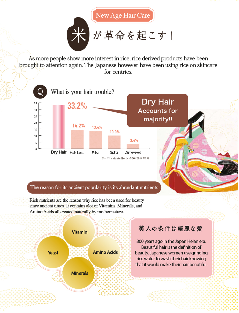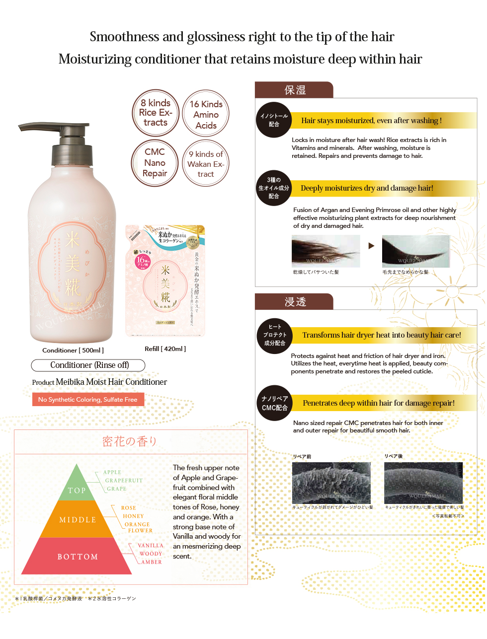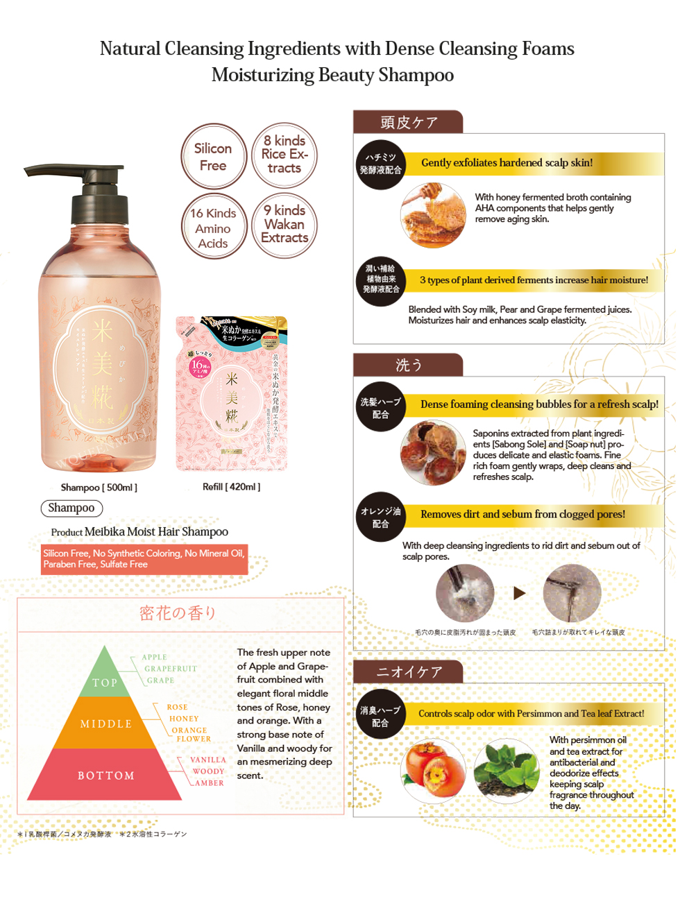 Key Ingredients: WATER, COCAMIDOPROPYL BETAINE, SODIUM C14-16 OLEFIN SULPONATE, COCAMIDE DEA, GLYCERIN, DIPROPYLENE GLYCOL, PPG-7, POLYQUATERNIUM-10, FRAGRANCE, SODIUM BENZOATE, CITRIC ACID, DISODIUM EDTA, BUTYLENE GLYCOL, ALCOHOL, RICE FERMENT FILTRATE (SAKE), SAPINDUS TRIFOLIATUS FRUIT EXTRACT, ORANGE YU (JTN), LACTOBACILLUS/GRAPE JUICE FERMENT FILTRATE, LACTOBACILLUS/PEAR JUICE FERMENT FILTRATE, TAURINE, SODIUM LACTATE, GLUCONOBACTER/HONEY FERMENT FILTRATE, POLYGLYCERYL-10 OLEATE, ORYZA SATIVA (RICE) POWDER, ORYZA SATIVA (RICE) GERM OIL, CYSTINE, CAMELLIA JAPONICA SEED OIL, LYSINE HCL, LACTIC ACID, LECITHIN, SACCHAROMYCES/PERSIMMON FRUIT JUICE FILTRATE EXTRACT, GLUTAMIC ACID, LEUCINE, GLYCINE, PAEONIA ALBIFLORA ROOT EXTRACT, HISTIDINE HCL, ORYZA SATIVA (RICE) BRAN OIL, VALINE, SERINE, THREONINE, SODIUM ASPARTATE, ISOLEUCINE, ALANINE, ALLANTOIN, CAMELLIA SINENSIS LEAF EXTRACT, PHENYLALANINE, SWERTIA JAPONICA EXTRACT, LACTOBACILLUS/SOYBEAN EXTRACT FERMENT FILTRATE, PHENOXYETHANOL, PRUNUS LANNESIANA FLOWER EXTRACT, ARGININE, LACTOBACILLUS/RICE BRAN EXTRACT FERMENT FILTRATE, SOLUBLE COLLAGEN, PROLINE, PAEONIA SUFFRUTICOSA ROOT EXTRACT, LILIUM CANDIDUM BULB EXTRACT, ORYZA SATIVA (RICE) BRAN EXTRACT, ANGELICA KEISKEI LEAF/STEM EXTRACT, ARTEMISIA CAPILLARIS FLOWER EXTRACT, TYROSINE, SAPONARIA OFFICINALIS LEAF EXTRACT, COIX LACRYMA - JOBI MA YUEN SEED EXTRACT, GLYCOSPHINGOLIPIDS, DISODIUM INOSINATE, DISODIUM GUANYLATE, ASCORBIC ACID, MALIC ACID.