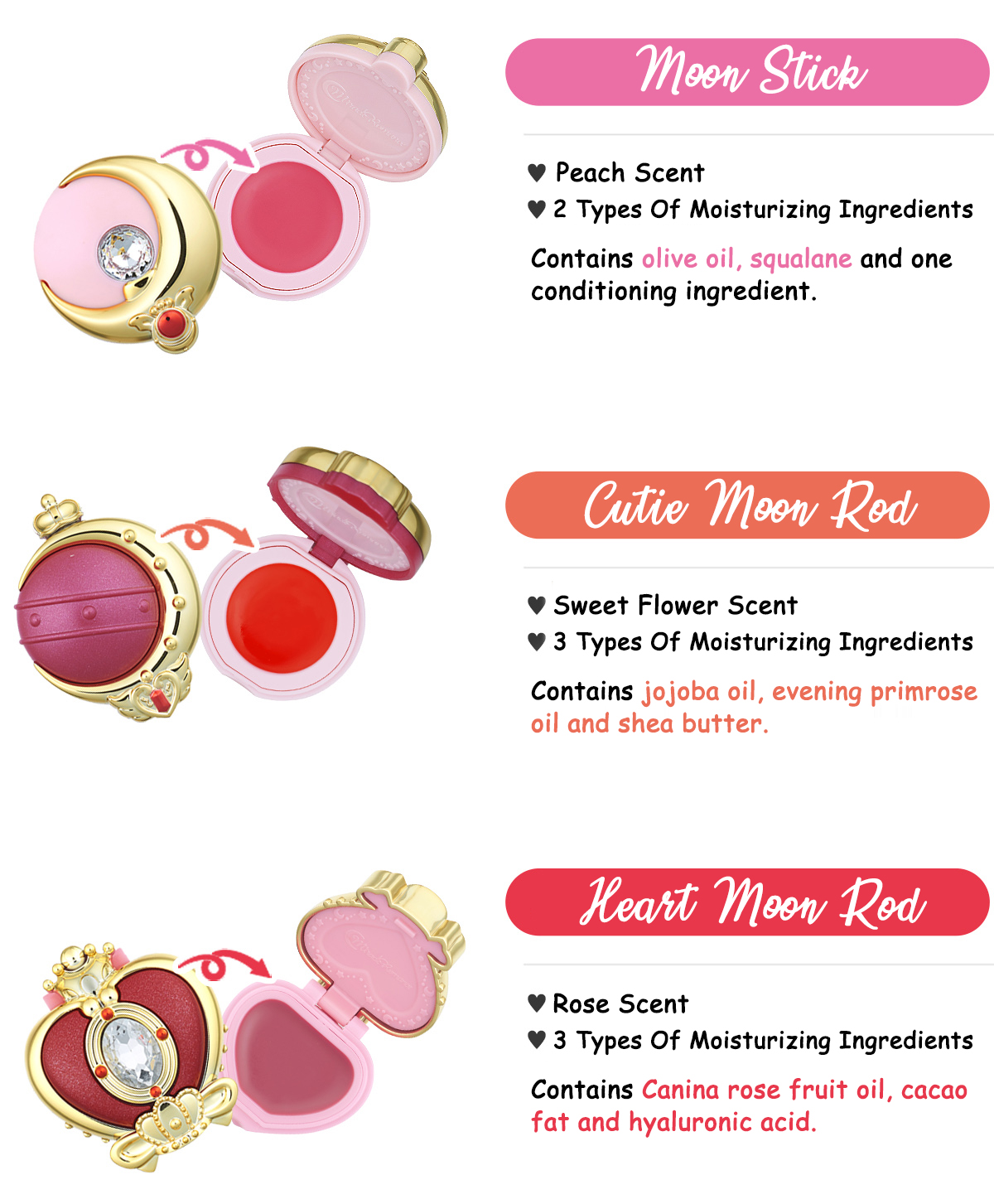 A slightly colored rose scented lip balm in a collectable Sailor Moon inspired case.