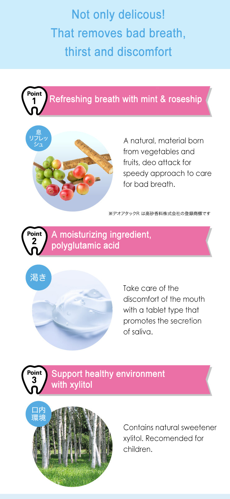 Key Ingredients: Green tea extract, coffee green bean extract, burdock powder / sweetener (xylitol, sorbitol, sucralose, acesulfame K), Ca stearate, powdered vegetable fat and oil, fragrance, HPC, polyglutamic acid, fine silicon dioxide