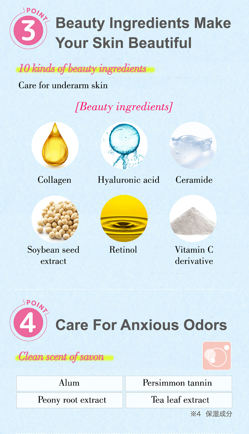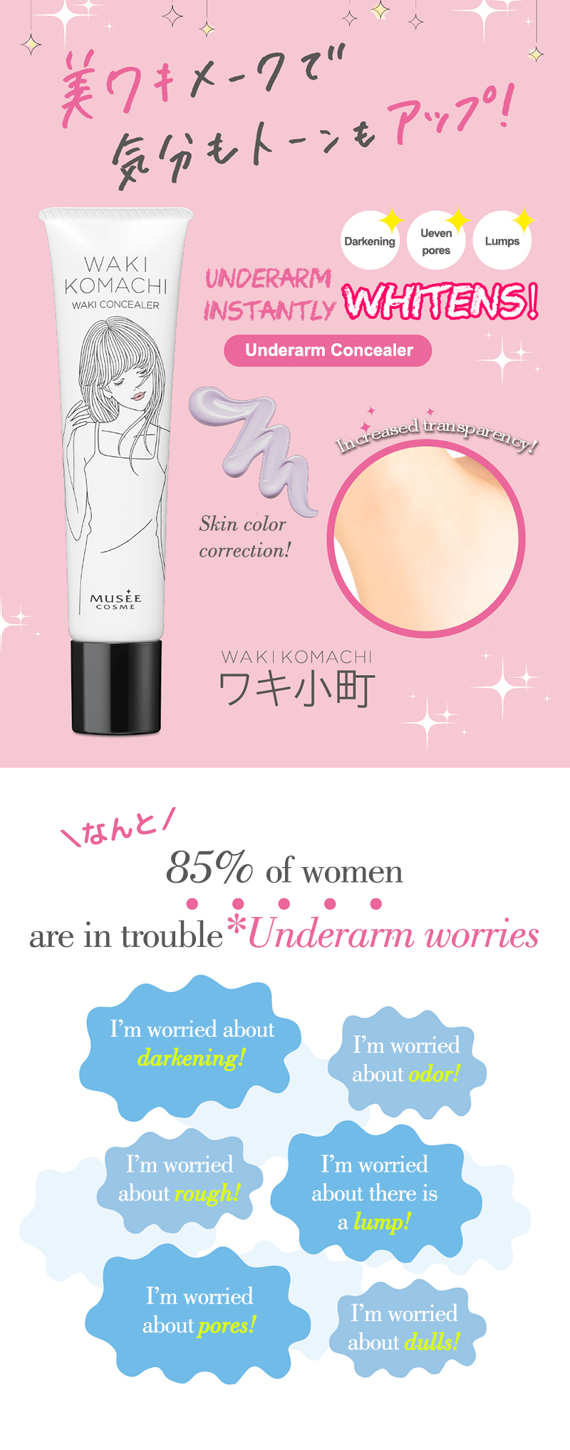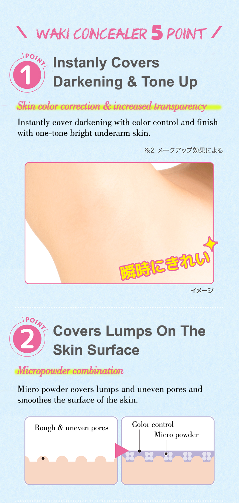 A concealer for underarms that instantly covers darkening of underarms, uneven pores, and lumps to create a beautiful armpit.