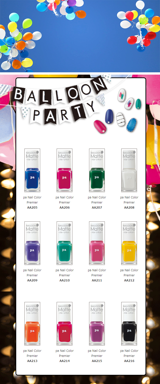 In the "pa balloon party" series 12 colors of "balloon matte" nail colors that reproduces a matte texture like a balloon. Vivid color, perfect for single color paint. Easy to use for pedicure, anyone can easily make fingertips that shine SNS.