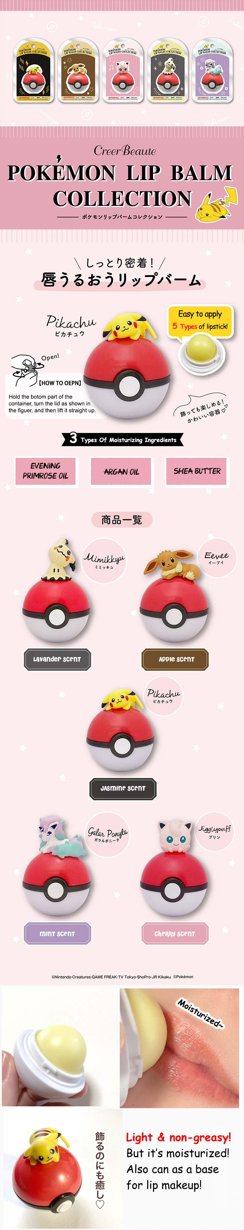 Bandai Creer Beaute Asia regularly launches popular character products, this season's new lip balm styling sense is full, In addition to moisturizing the delicate lips, usually can also be placed at home or company decoration. Five super cute Pokemon lying on the ball, it's super healing! Suitable for gift or personal use, quickly take all the Pokemon!