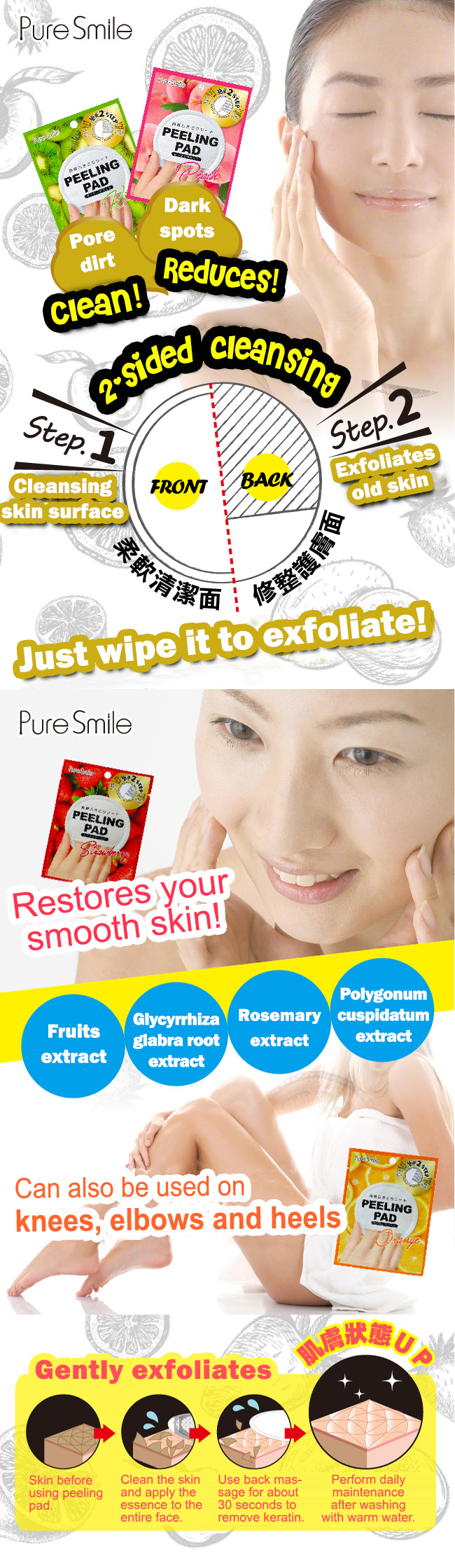 2-sided cleansing pad that helps removes dark pores,  make up and dirt. Combination of strawberry fruit extracts  tightens skin and prevents roughness. Licorice root extract  protects skin while Chaba extract moistures skin and keep  it healthy.