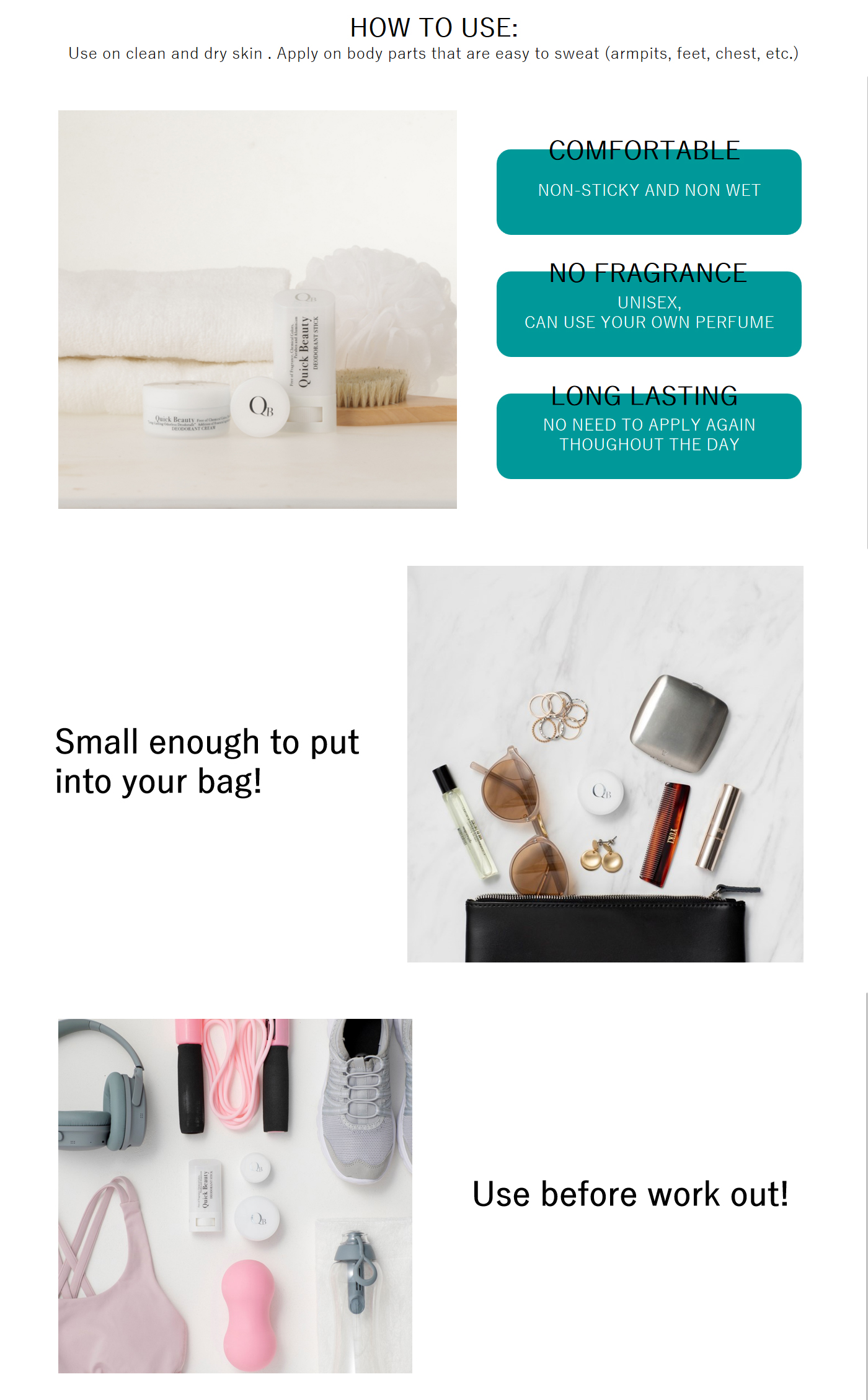 How to use: Take a small amount of the cream by fingers and rub it on underarms, feet and wherever you sweat. Please apply it in a sanitary condition after taking a shower and after drying.