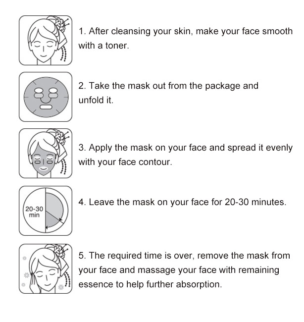 HOW TO USE: Cleanse and exfoliate face if necessary. Apply toner. Remove the mask from the packaging and gently unfold. Align the shape of the mask with your face and gently form it to the contours of your face. Remove the mask about 10 minutes later, and pat the remaining beauty essence on skin.