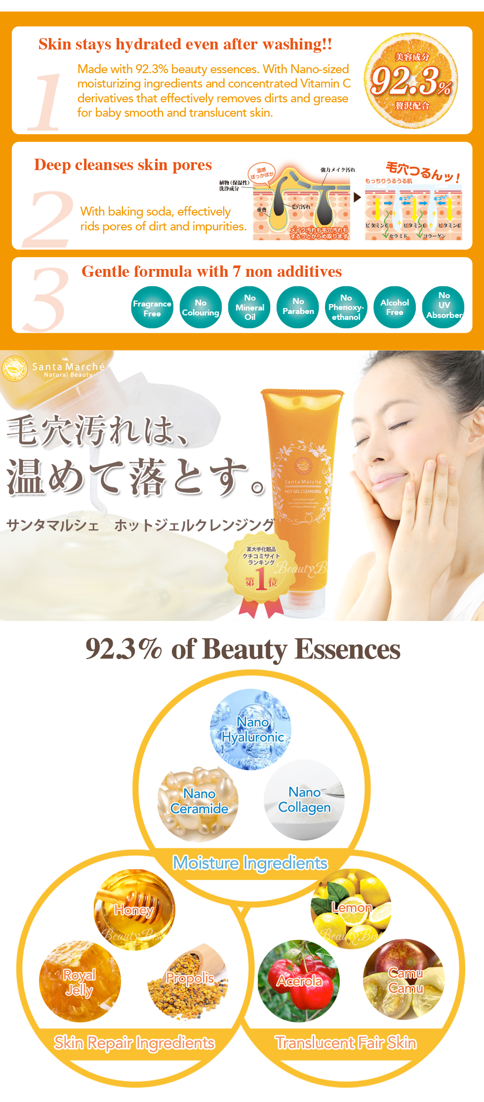 Key Ingredients: Glycerin, DPG, グリセレス -26, water, olive fruit oil, royal jelly, honey, propolis extract, coconut oil fatty acid PEG-7 glyceryl, lauryl glucoside, Coptis japonica root extract, tetrahexyl decanoic acid ass col building, phosphorus acid ass col building Mg, palmitic acid ass col building phosphoric acid 3Na, hydrogen carbonic acid Na, glycyrrhizic acid 2K, hydrogenation lecithin, soybean sterol, ceramide NG, honey extract, pentylene glycol, coconut oil alkylglucoside, orange oil, ミルシアリアデュビア fruit extract, lemon fruit extract, artichoke leaf extract, hydrolysis collagen, hydrolysis hyaluronic acid, acerola fruit extract, Cal bomber, TEA, BG, (styrene /VP) copolymer