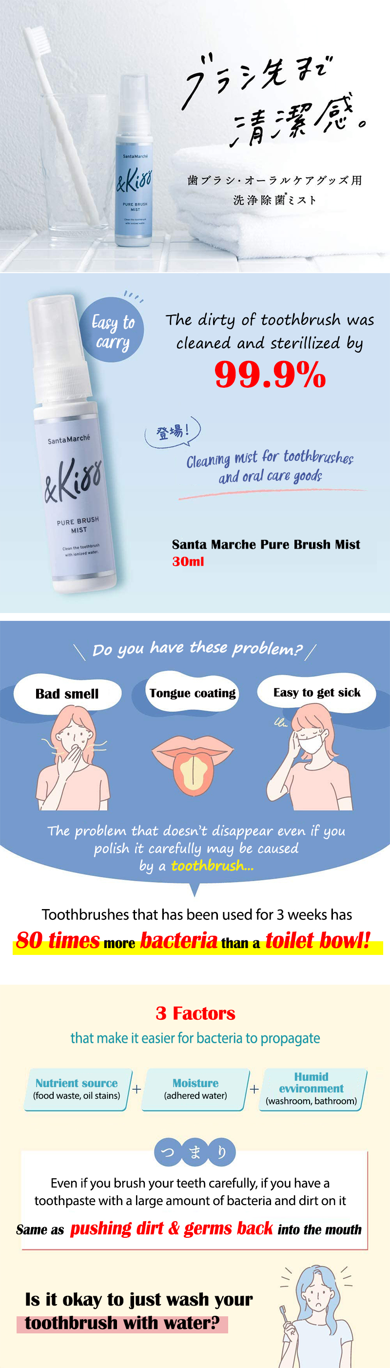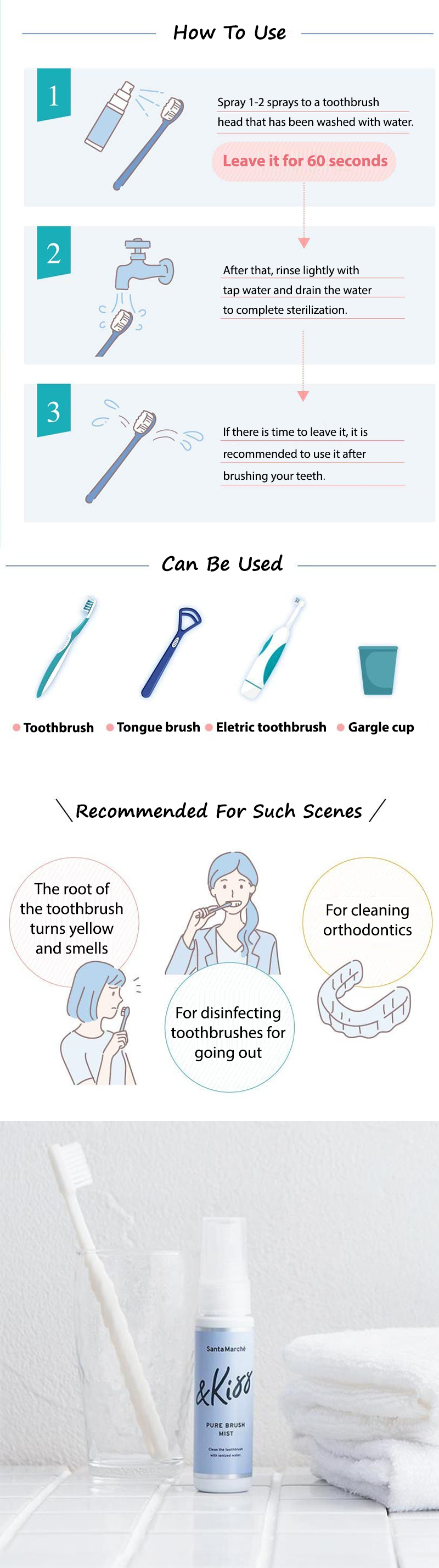Spray 1-2 sprays to a toothbrush head that has been washed with water leave it for 60 seconds. After that, rinse lightly with tap water and drain the water to complete sterilization. If there is time to leave it, it is recommended to use it after brushing your teeth. It can also be used for electric toothbrushes and orthodontic appliances.