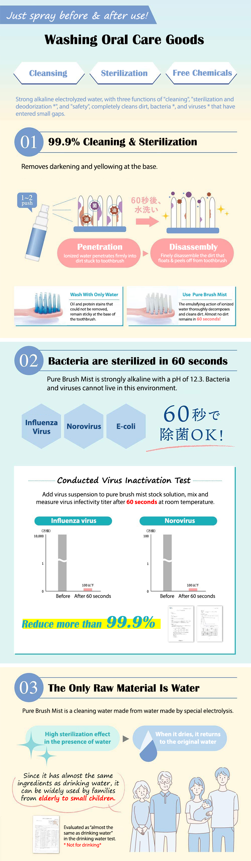 - Washing water made of almost the same ingredients as drinking water. It has a high sterilizing eect when it is moist, and returns to the original water when it dries, so it can be widely used even in homes with small children. Not for drinking.
