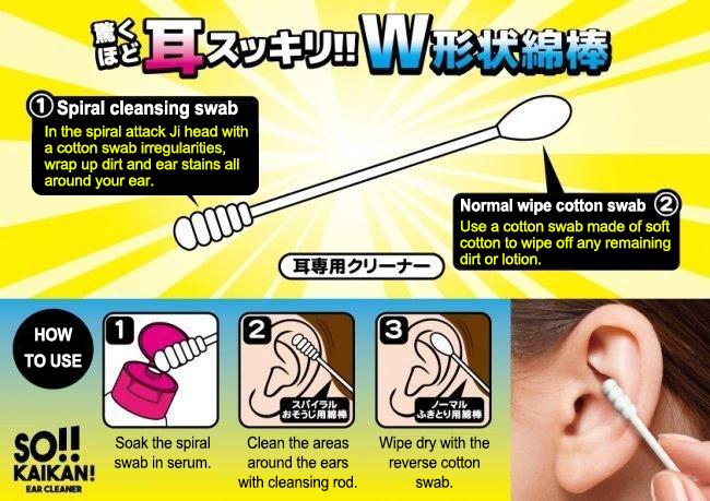 Soak the spiral swab in serum and clean your ears with it. Wipe dry with the reverse cotton swap