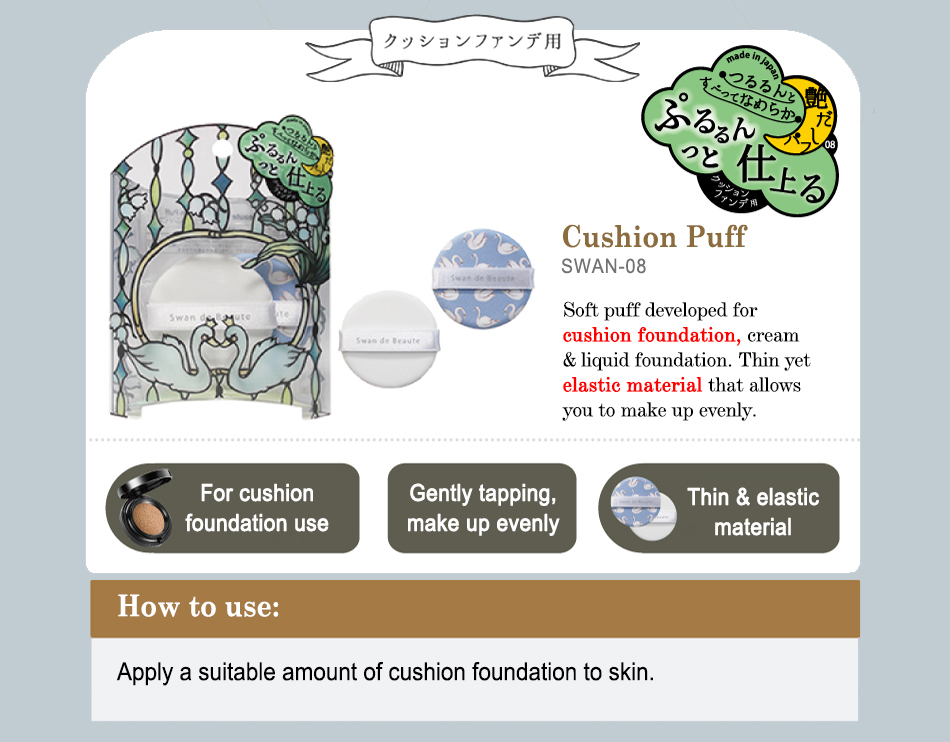 Soft puff developed for cushion foundation, cream & liquid foundation. Thin yet elastic material that allows you to make up evenly.