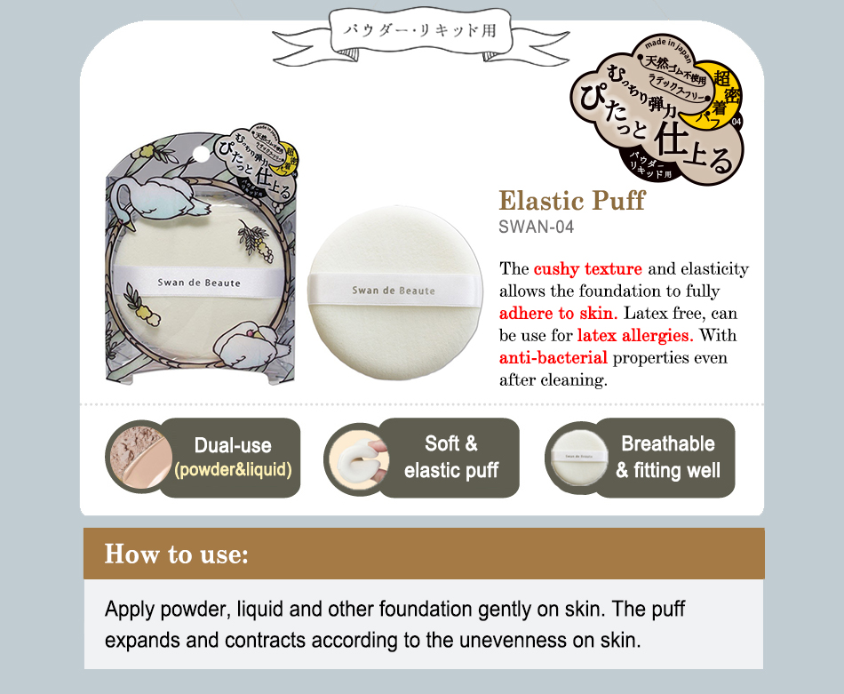 The cushy texture and elasticity allows the foundation to fully adhere to skin. Latex free, can be use for latex allergies. With anti-bacterial properties even after cleaning.