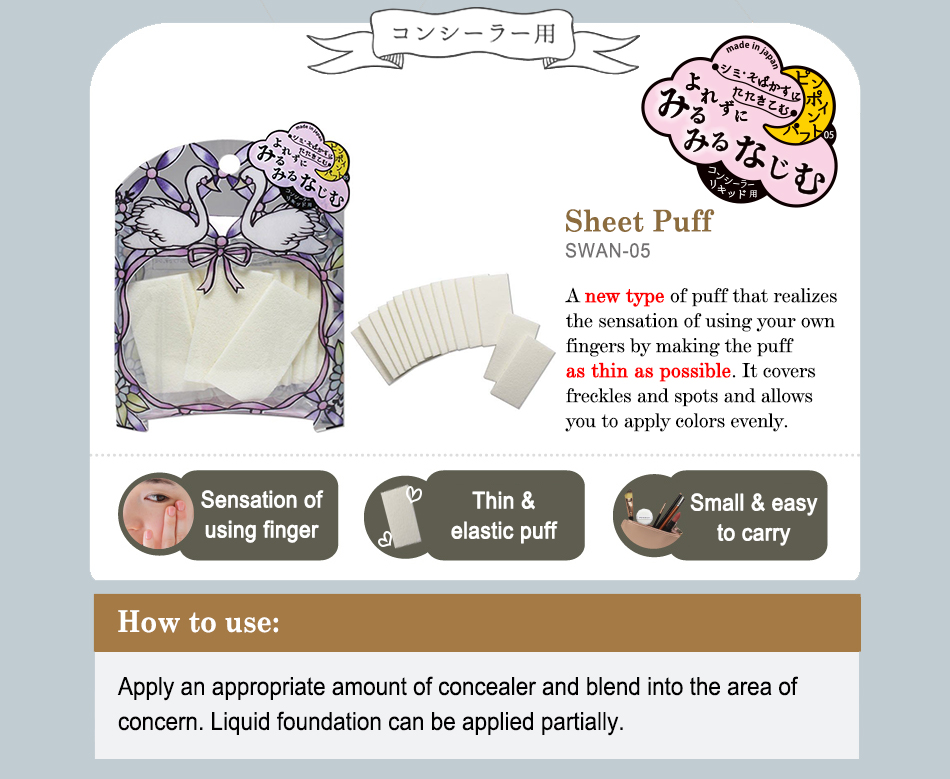 A new type of puff that realizes the sensation of using your own fingers by making the puff as thin as possible. It covers freckles and spots and allows you to apply colors evenly.